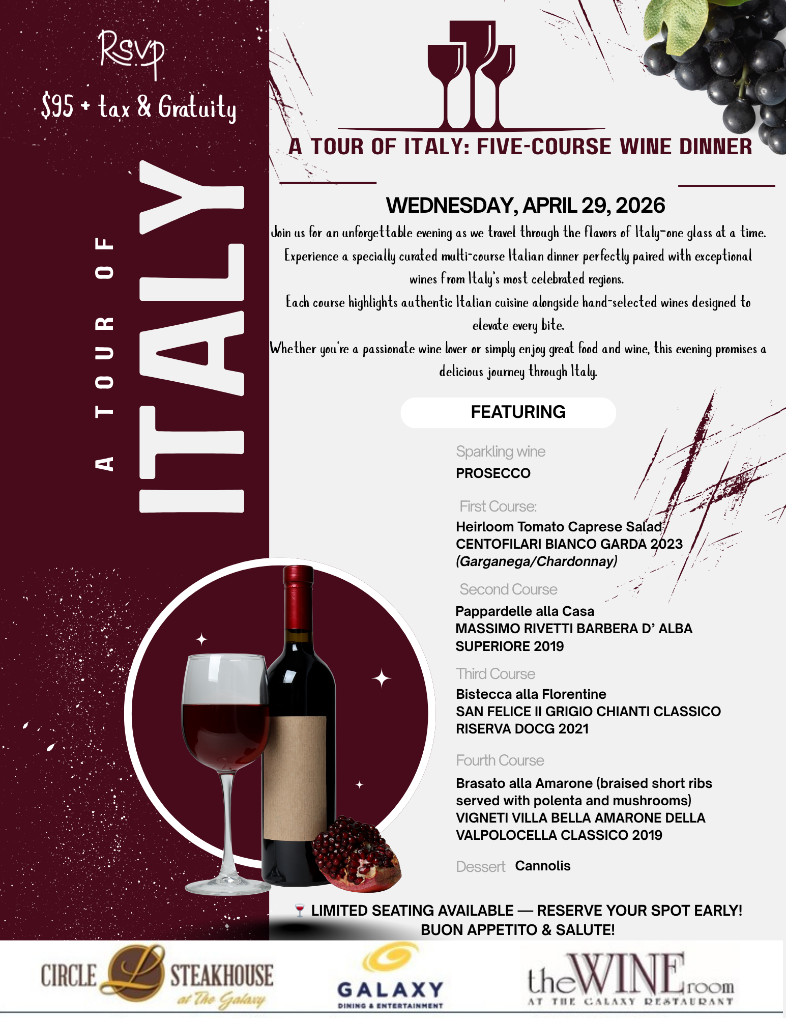 Join us for an unforgettable eveing as we travel through the flavors of Italy, one glass and dinner course at a time.