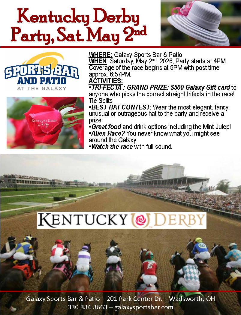 Join us for 152nd Running of the Kentucky Derby. Party begins at 4PM and goes to race post time of around 6:57PM. We will offer a host of special Derby food and libations along with a trifecta winning prize of $500 Galaxy gift card. Wear your hat for the best Hat contest!