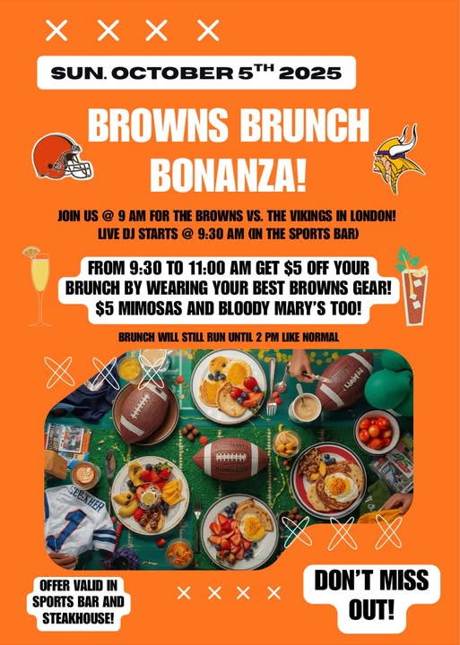 Browns VS Vikings playing in London. We open at 9AM in time for the 9:30AM game against the Vikings. DJ starts @ 9:30AM to get the party started! Get $5 off our Fabulous Brunch starting at 9:30am to 11am. Regular brunch goes until 2PM. Join us and show your Browns Spirit!. We also feature $5 Mimosas and Bloody Marys.
